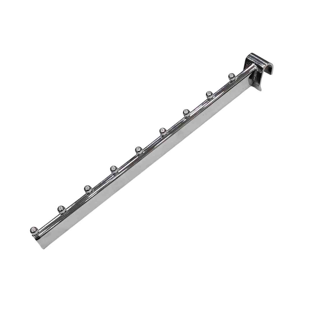 The Oval Pipe Ball Bracket Slope is a sleek and functional display accessory designed for modern retail environments. With a sloped design and ball-end stops, it provides secure and stylish hanging for apparel and merchandise. Available in Black, Chrome, and Hammer Grey finishes, this bracket fits seamlessly with oval pipe display systems.