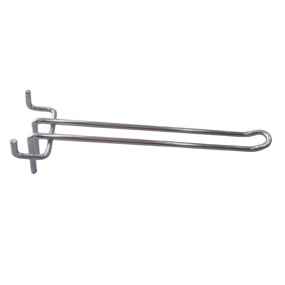 Upgrade your display setup with the Peg Board Double Hooks Chrome Plated, designed for added strength and stability. These double hooks are perfect for holding heavier or multiple items on standard pegboard systems, making them ideal for retail stores, hardware shops, and showroom displays.